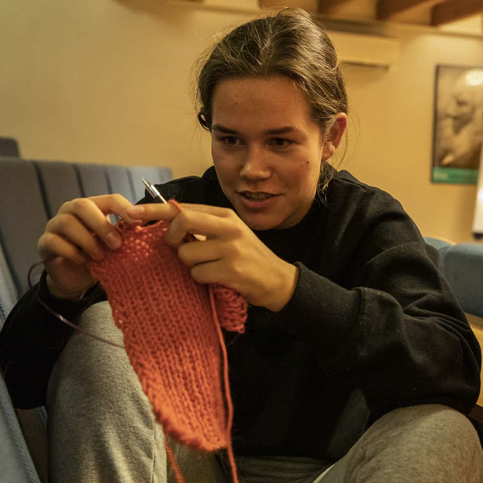 Her strikker og broderer elevene flittig. Kanskje sitt aller første skjerf? Noen har mer erfaring enn andre og det kommer godt med når vi er over 25 stykker som skal i gang med ulike nåler, pinner, garn og tråder. Men man har lov til å være nybegynner her. De som ikke kan får lære hvordan man trer i en nål, syr et korssting eller hvordan man strikker et skjerf.