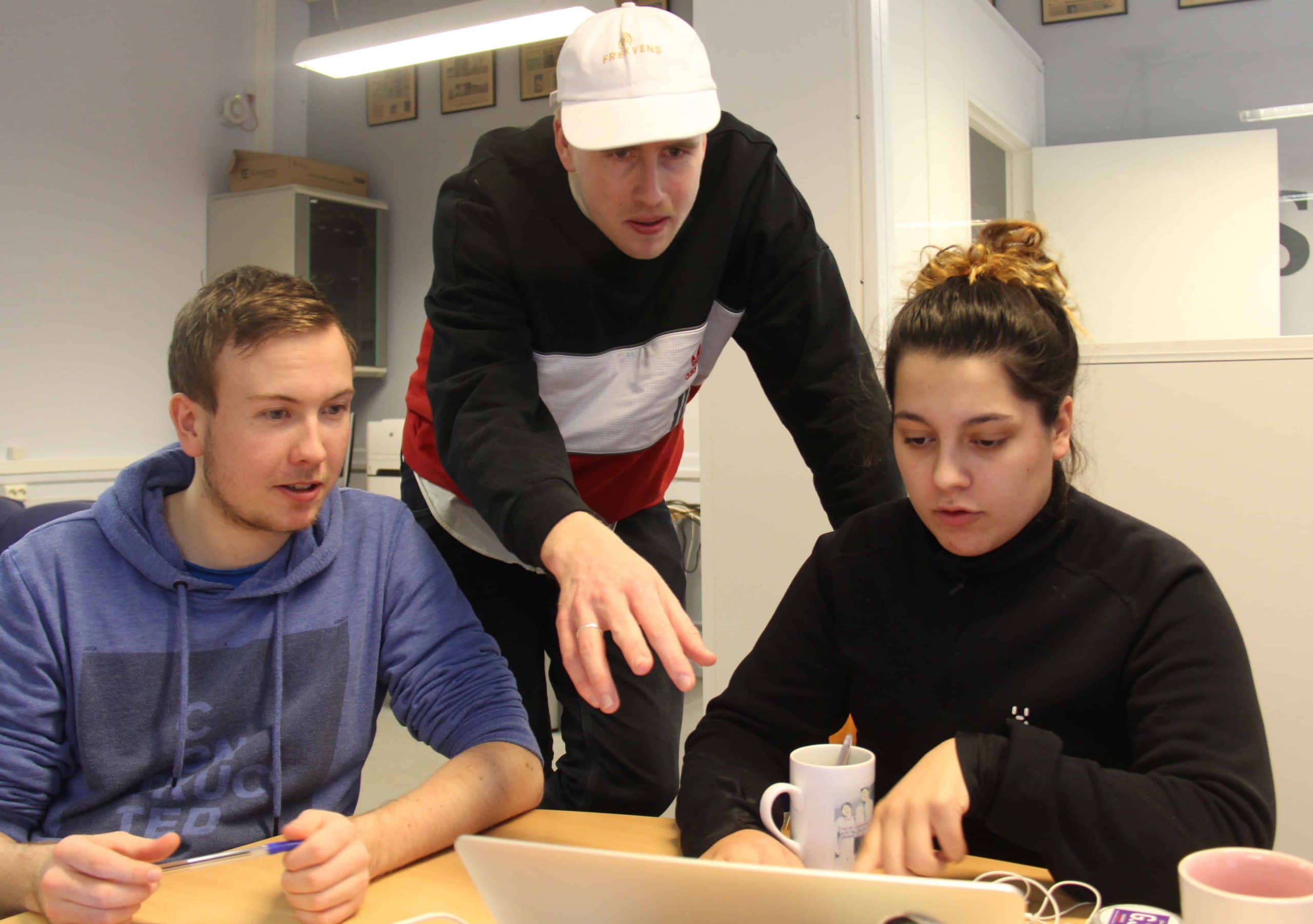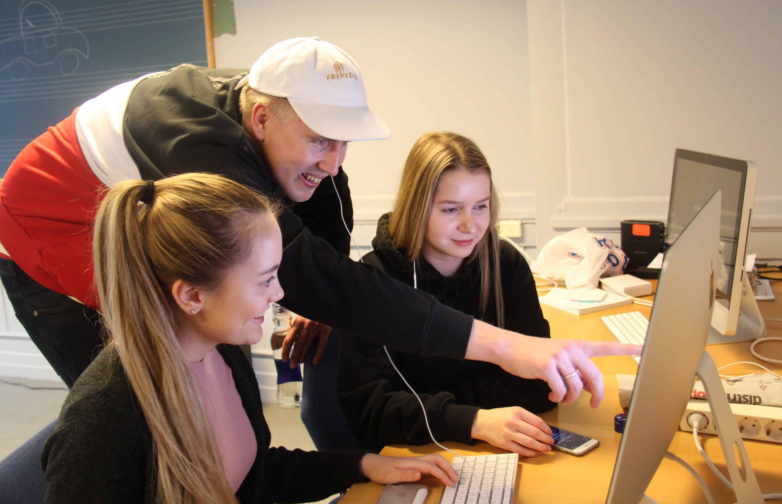 -Innfallsvinkler og en bevisst ide rundt å gjøre lytteren nysgjerrig på hva han eller hun har i vente er veldig viktig i podkast-sammenheng, sier radioelev Hanna Levin, imens hun og medelev Andrea D. Johansen legger siste hånd på verket i forbindelse med Workshopen de har vært med på i dag.